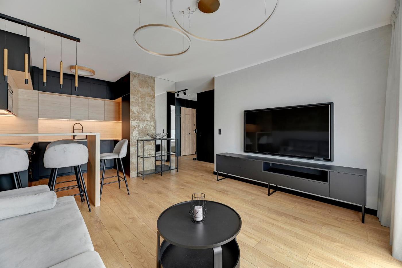 Apartament typu Deluxe z 1 sypialnią. This apartment consists of 1 living room, 1 separate bedroom and 1 bathroom with a shower and a hairdryer. Guests can make meals in the kitchenette that is equipped with a stovetop, a refrigerator, a dishwasher and kitchenware. This apartment features a washing machine, a tea and coffee maker, a flat-screen TV and a patio. The unit offers 2 beds. Apartament - 4 osobowy. Powierzchnia pokoju ok.: 48 mkw.
