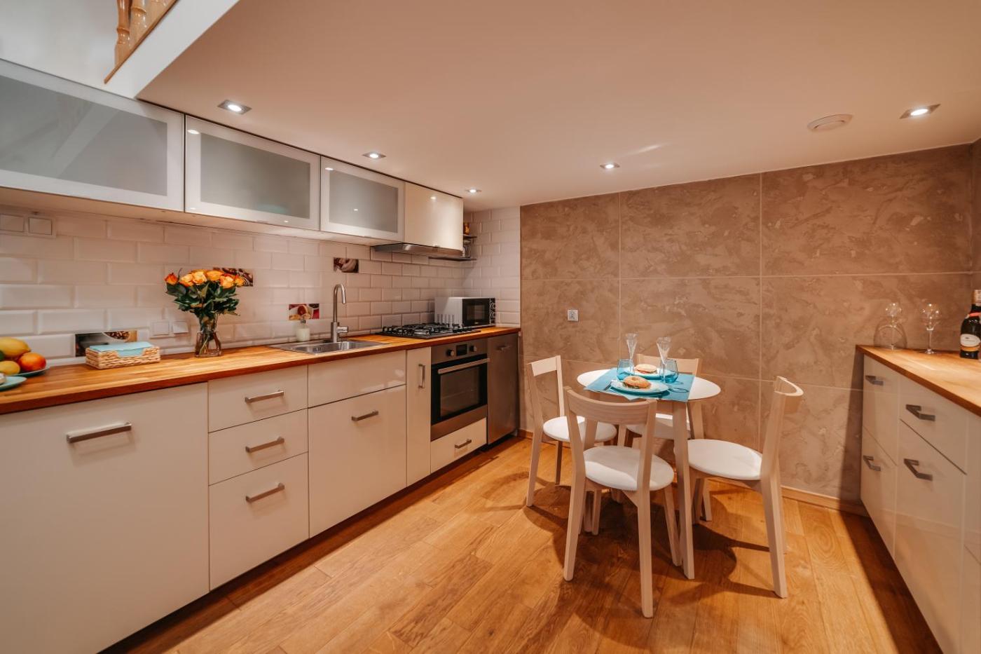 Oferta apartamentu obejmuje sypialnię (1), salon, kuchnię z pełnym wyposażeniem, w tym lodówką i ekspresem do kawy, a także łazienkę (1) z prysznicem oraz bezpłatnym zestawem kosmetyków. W apartamencie zapewniono ręczniki i pościel.