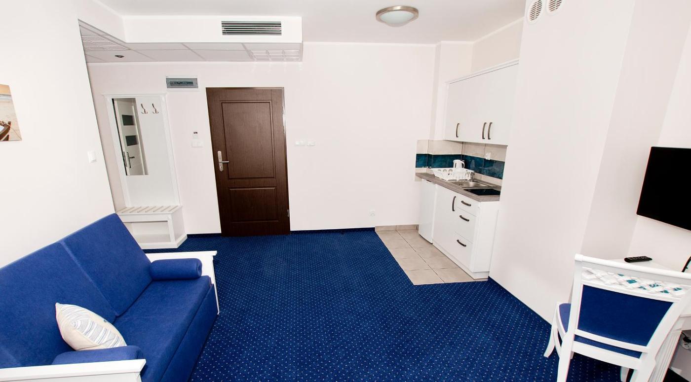 Apartament z 1 sypialnią, balkonem i widokiem na port. Ten apartament typu suite z balkonem wyposażony jest w zestaw do parzenia kawy i herbaty oraz czajnik elektryczny. Do pokoi tej kategorii można wstawić dodatkowe łóżko. Apartament - 3 osobowy. Powierzchnia pokoju ok.: 35 mkw. ;