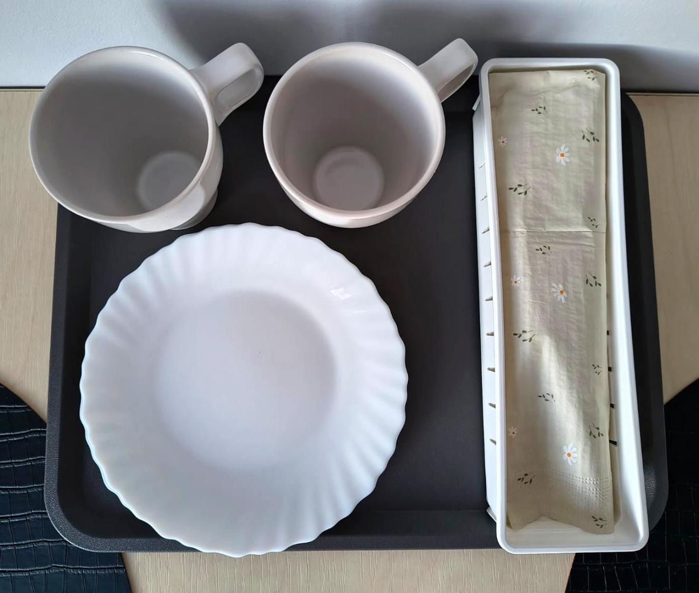Wyposażenie kuchni obejmuje także lodówkę, mikrofalówkę, płytę kuchenną i czajnik.